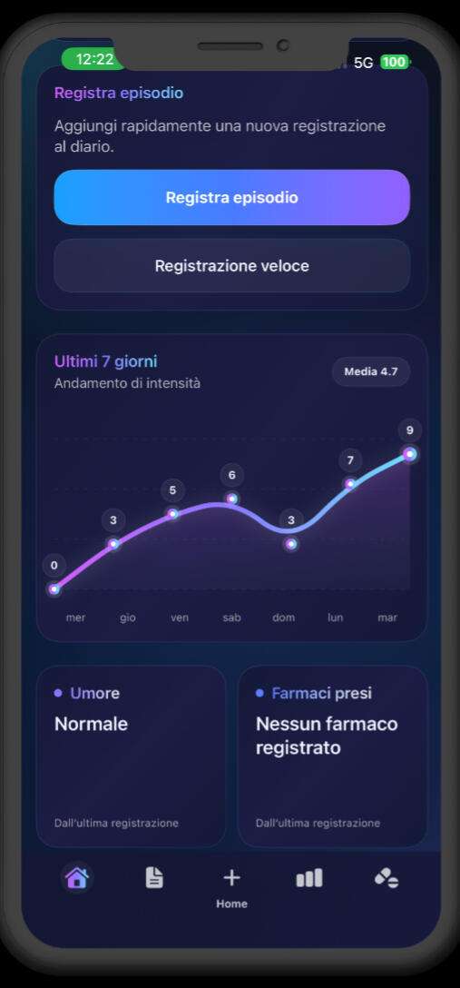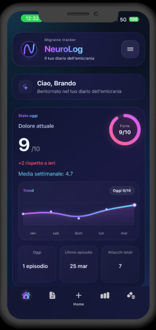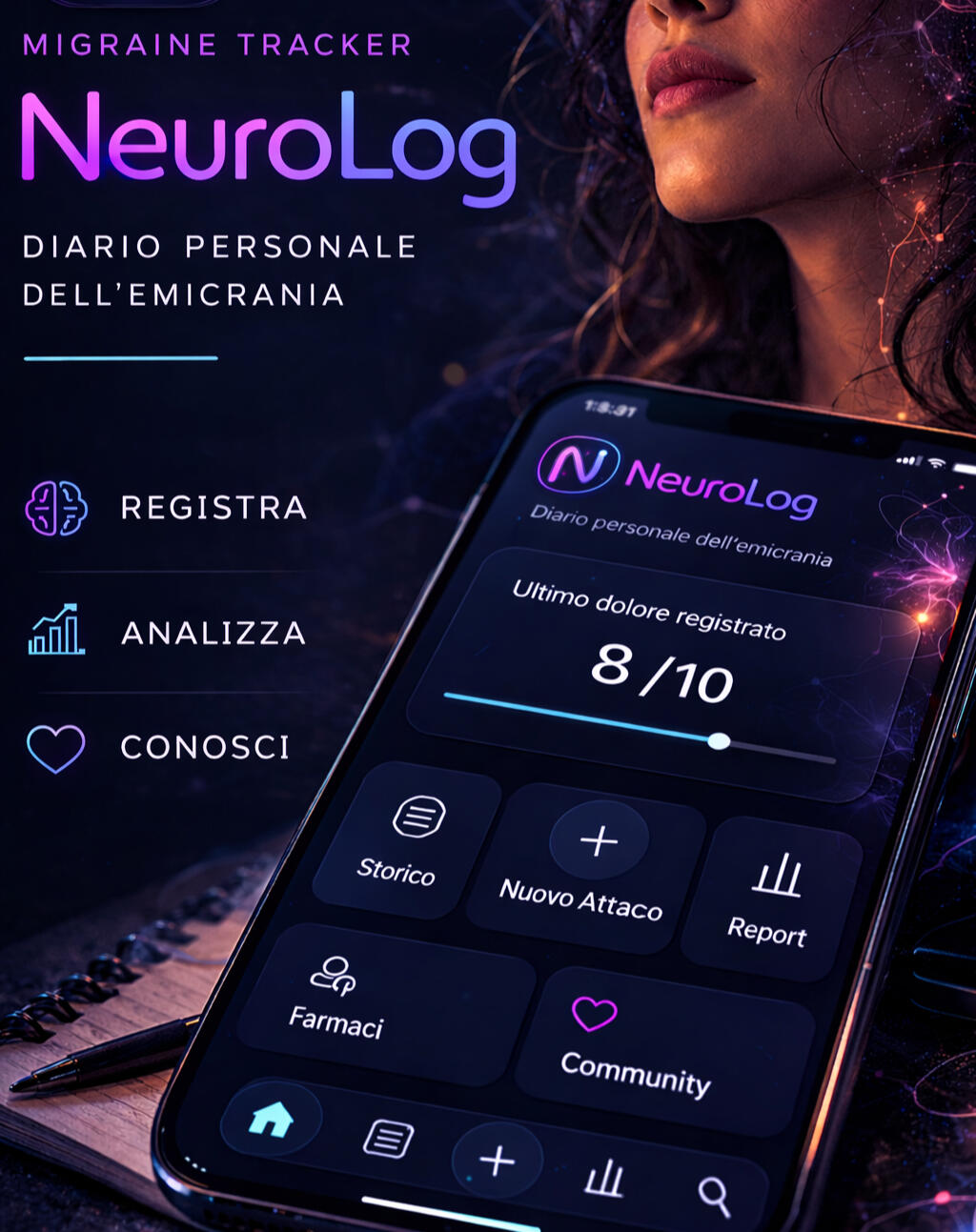 NeuroLog è un diario pensato per chi soffre di emicrania e vuole monitorare sintomi, intensità, aura, trigger e farmaci in modo semplice e ordinato.