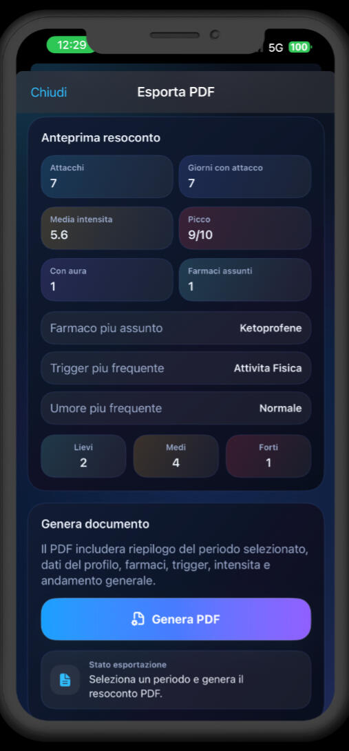 Genera un resoconto semplice e leggibile da condividere con neurologo o centro cefalee, così arrivi più preparato alle visite.